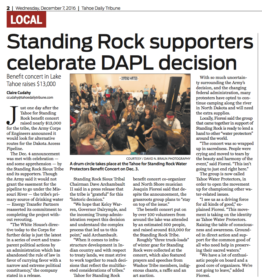 Coverage of a Lake Tahoe gathering to benefit the Standing Rock Sioux Tribe in their opposition to the Dakota Access Pipeline.