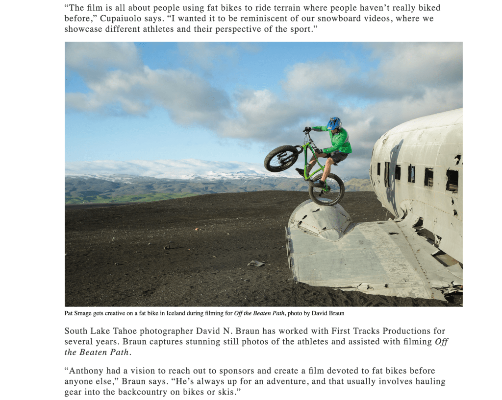 Tahoe Quarterly article about the evolution of First Tracks Productions. Included is an image from Iceland of Pat Smage on an abandoned plane wreck taken during the filming of “Off the Beaten Path.“