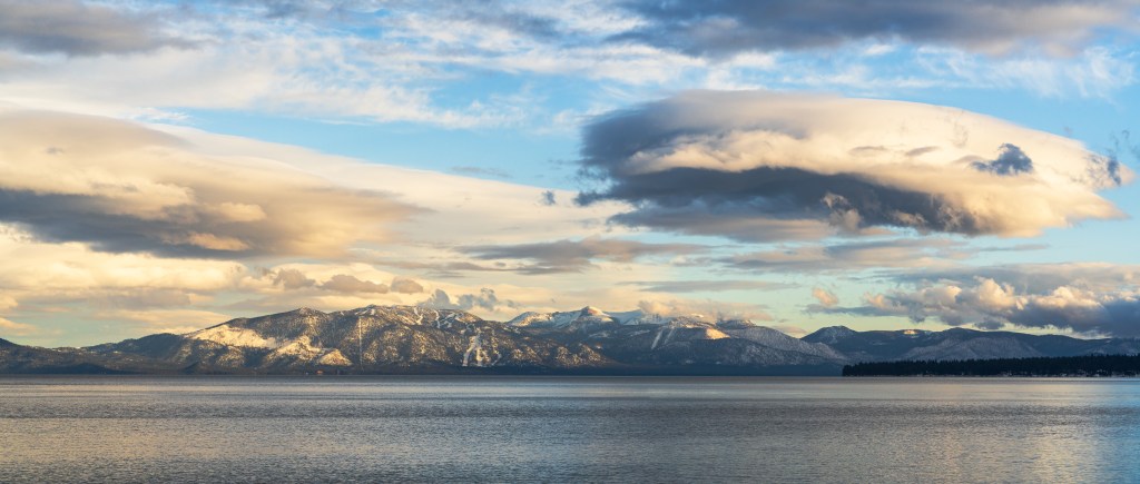 Three image panorama taken last winter, prior to a storm system moving into the Lake Tahoe basin. This image was was made possible by standing on a public pier along the west shore.