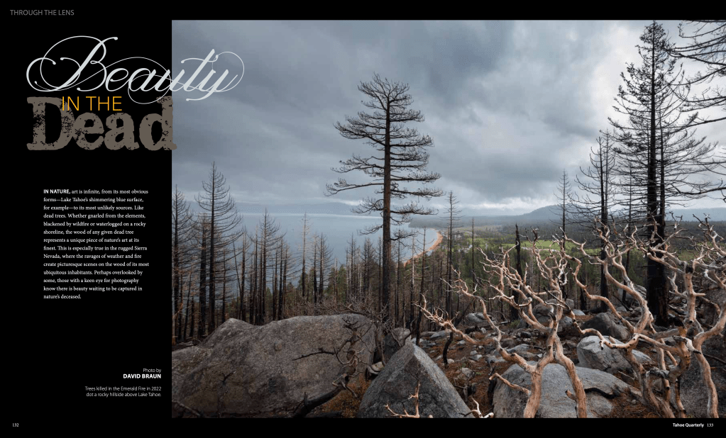 “IN NATURE, art is infinite, from its most obvious forms—Lake Tahoe’s shimmering blue surface, for example—to its most unlikely sources. Like dead trees. Whether gnarled from the elements, blackened by wildfire or waterlogged on a rocky shoreline, the wood of any given dead tree represents a unique piece of nature’s art at its finest. This is especially true in the rugged Sierra Nevada, where the ravages of weather and fire create picturesque scenes on the wood of its most ubiquitous inhabitants. Perhaps overlooked by some, those with a keen eye for photography know there is beauty waiting to be captured in nature’s deceased.”